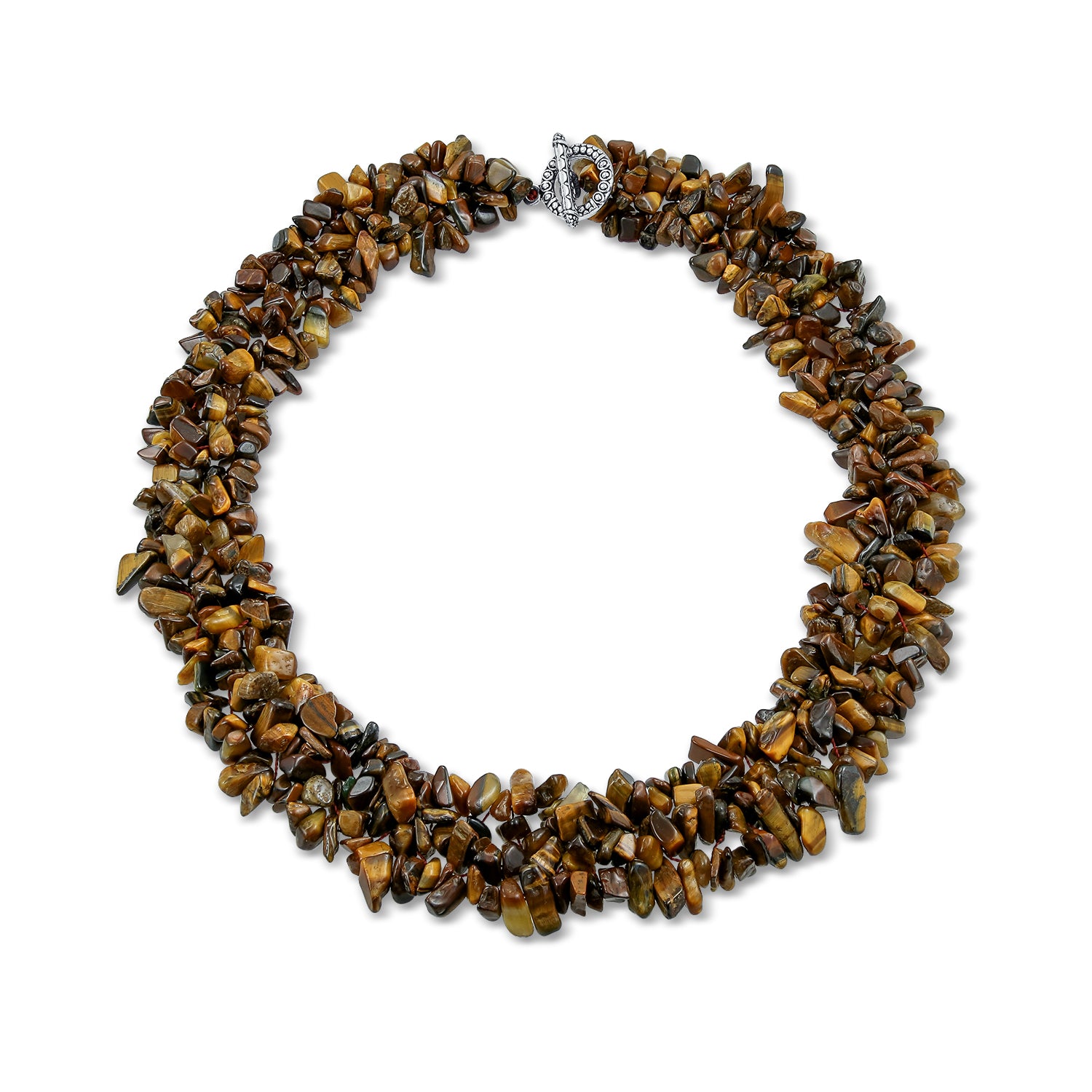 - Brilliant brown and Gold Plated Tiger Eye chips are stung on an interwoven multi strand design. Stones May Vary in Size and Color