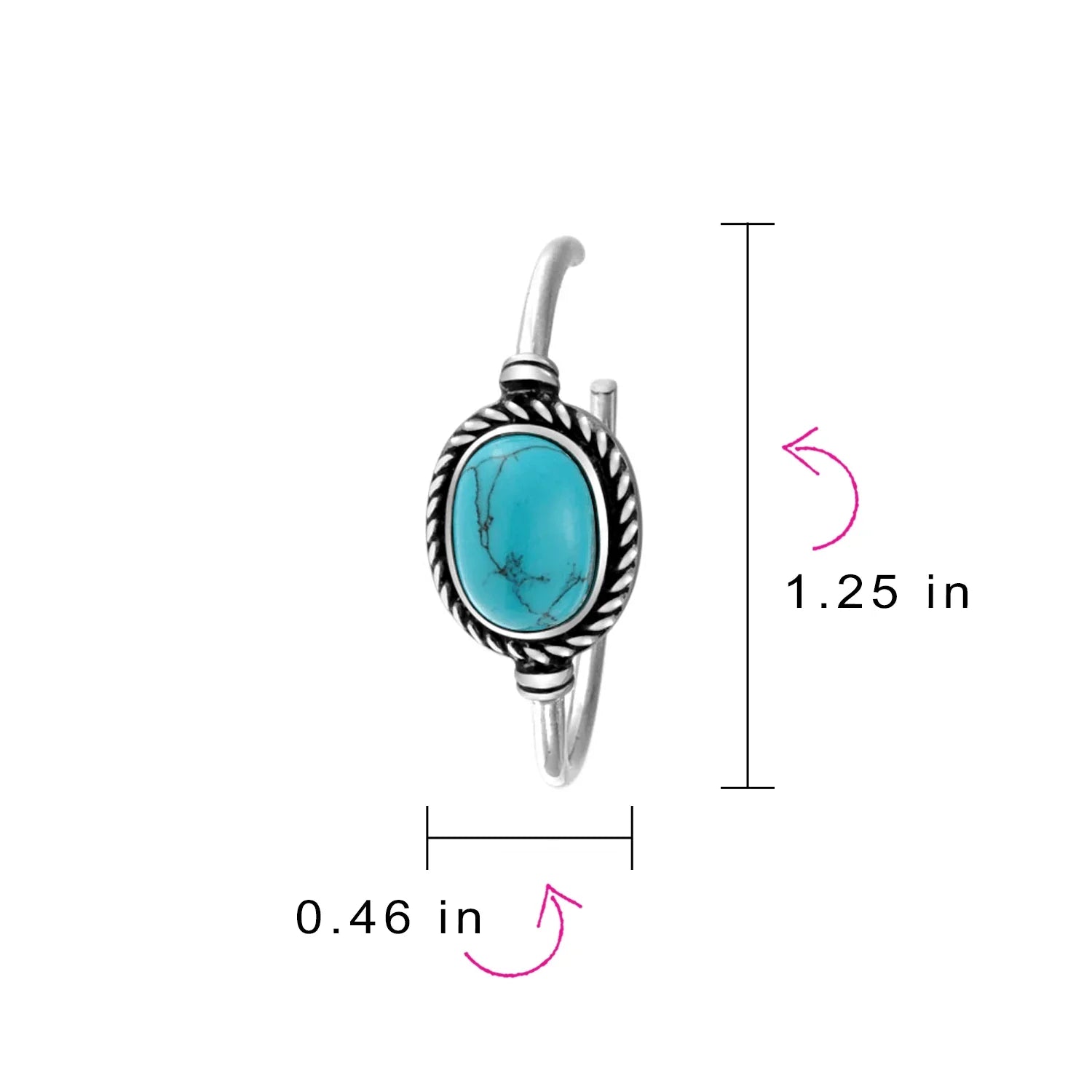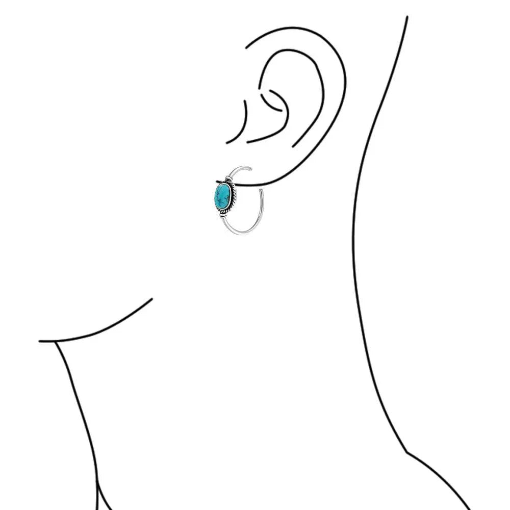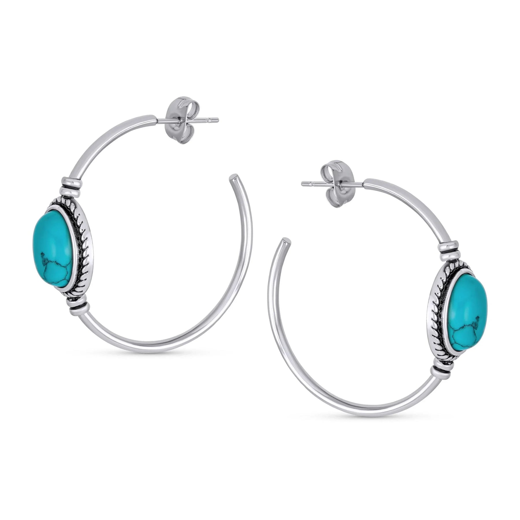 Western Oval Blue Turquoise CZ Hoop Earrings Silver 1.25Inch