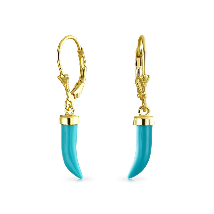 - Enhance your ensemble with vibrant color and good fortune through these exquisite dangle earrings, featuring an elegant Italian horn motif in vivid blue Turquoise. The 14K gold-plated .925 silver lever back adds a luxurious touch to this standout piece.
