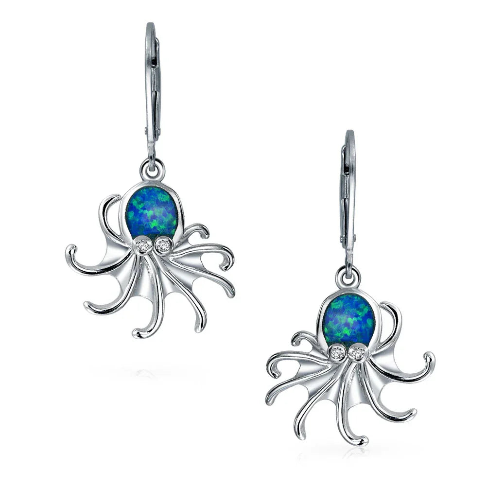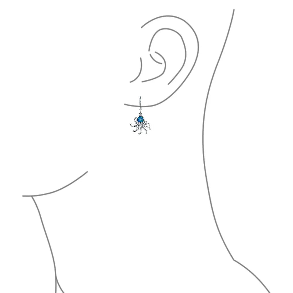 • Our whimsical octopus earrings make a splash in your jewelry box. Playful and fashionable, she will adore these sterling silver earrings. Rhodium plated to resist tarnish, they shine brightly. Created Blue Opal adds a pop of color, framing her face stylishly. Nautical jewelry is fun and trendy, season after season. Mix with other Marine Life or October birthstone jewelry. Featuring tiny CZ eyes, these earrings are perfect for women of all ages. Order your sterling silver octopus earrings today!