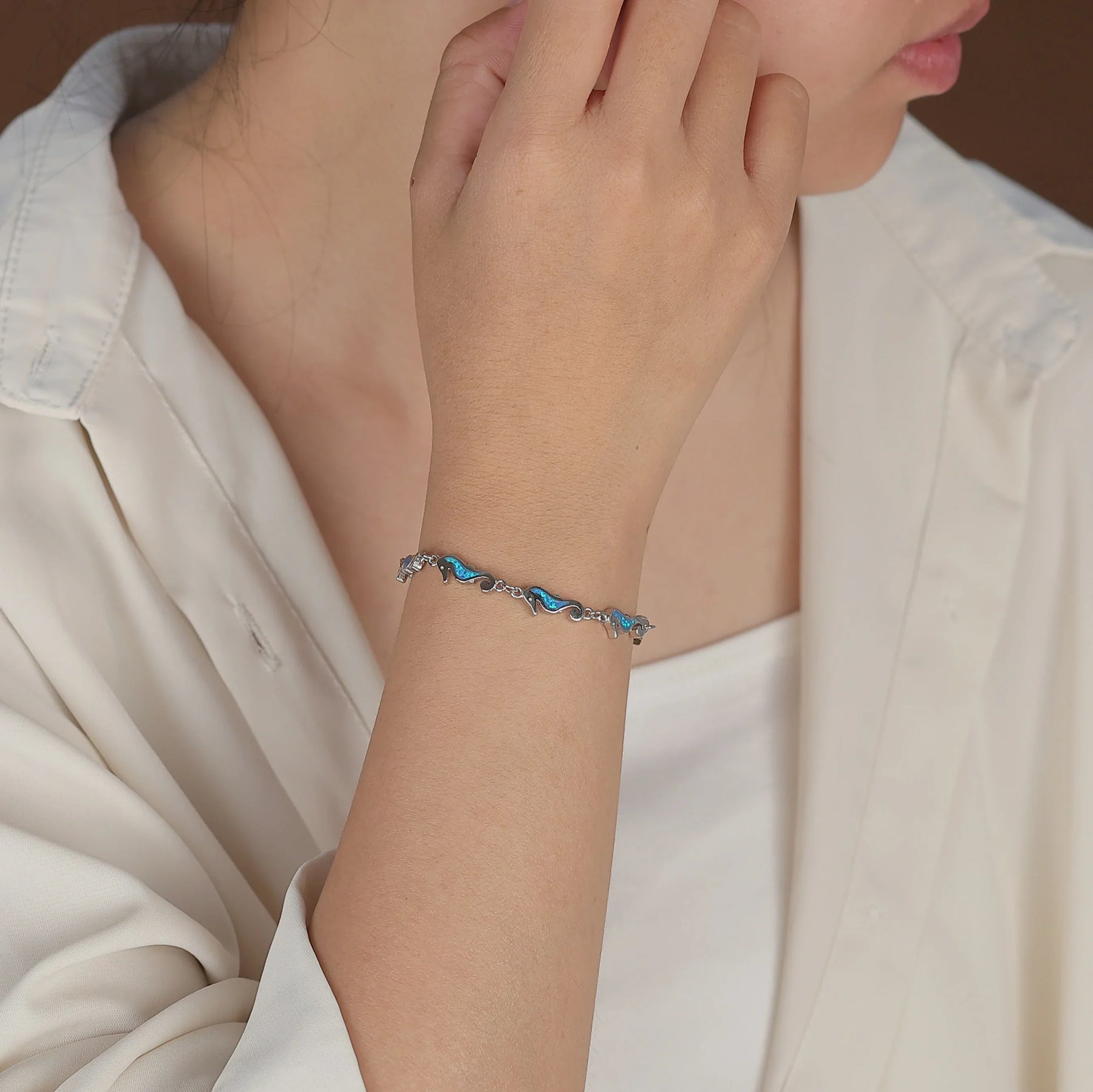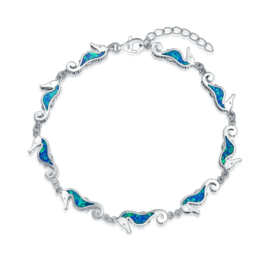 - This stunning .925 sterling silver charm bracelet enhances any outfit. Features a seahorse motif with a blue opal center. Shimmers in green and blue tones. Material: .925 Silver, Synthetic Opal. Measures: 7.5" L x 0.29" W. Weight: 7.4 grams.