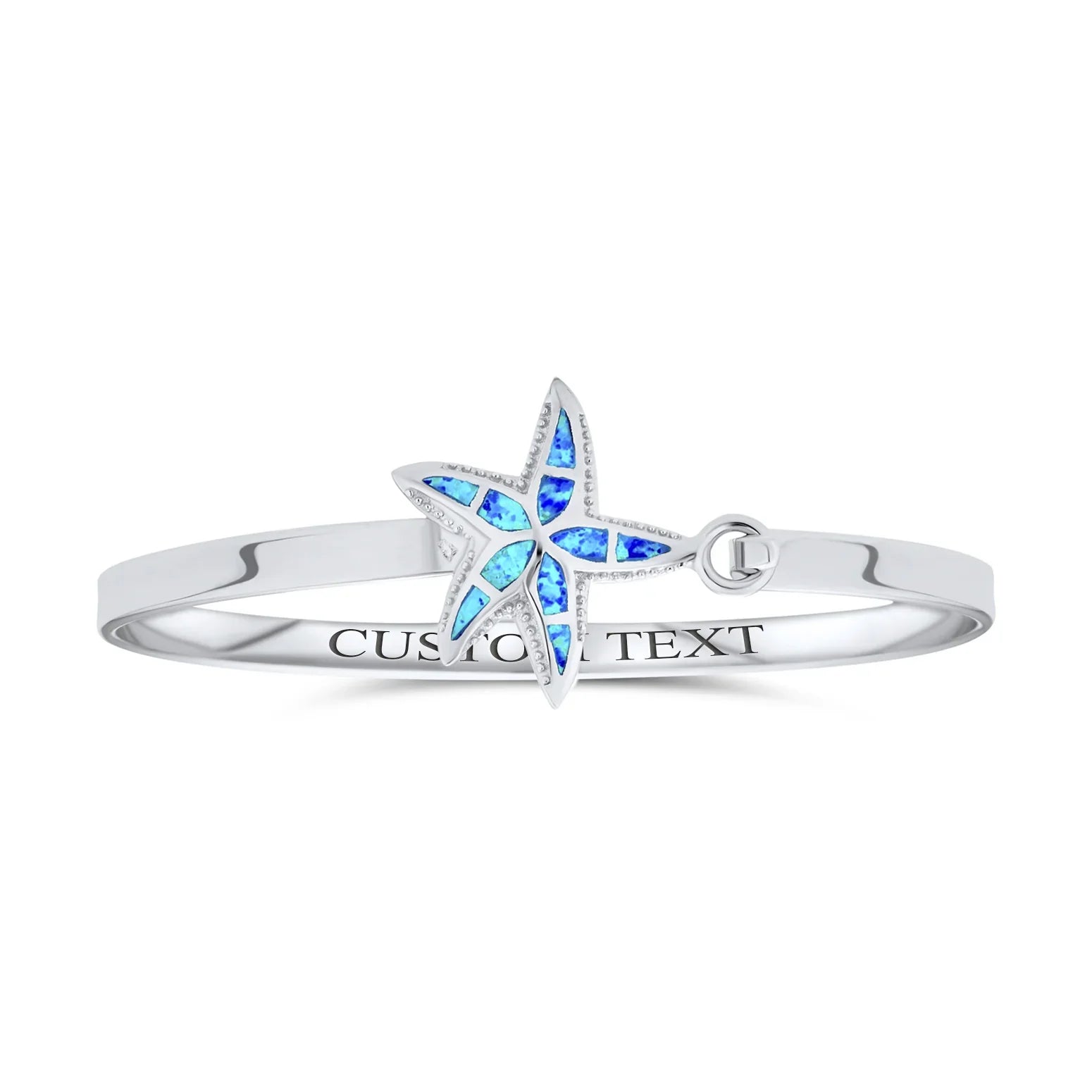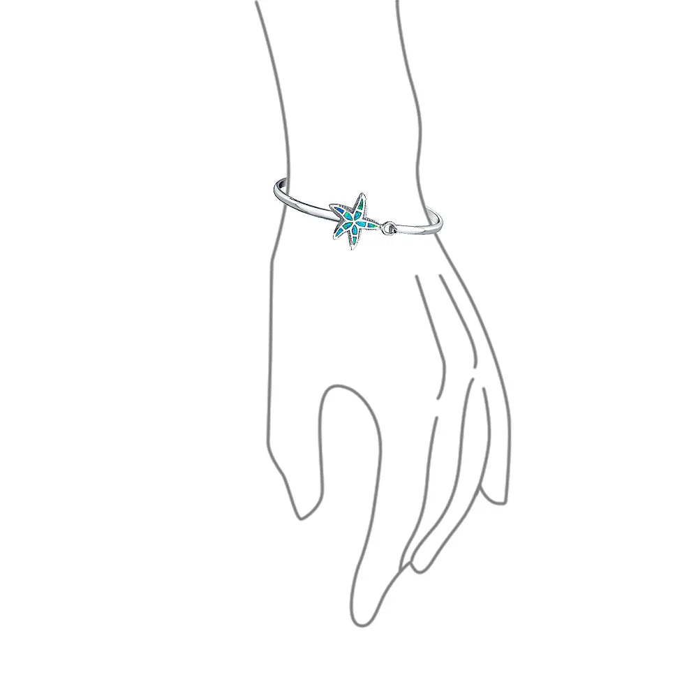 - Enhance your style with a touch of enchanting nautical charm by wearing this delightful .925 sterling silver bangle bracelet. Featuring a captivating starfish motif at its center, it dazzles with stunning, color-changing synthetic blue opal and intricate etched detailing.