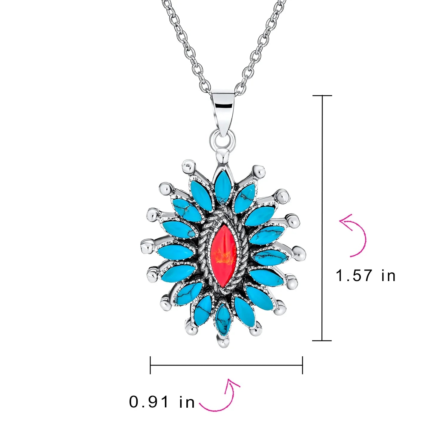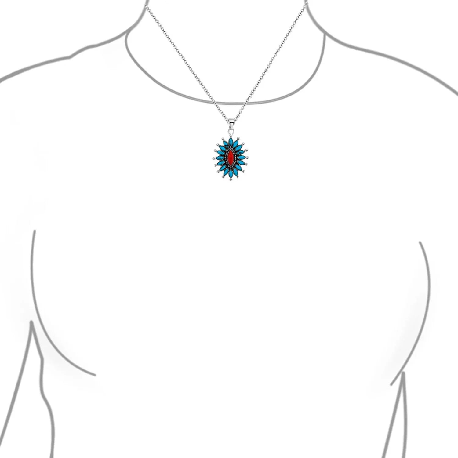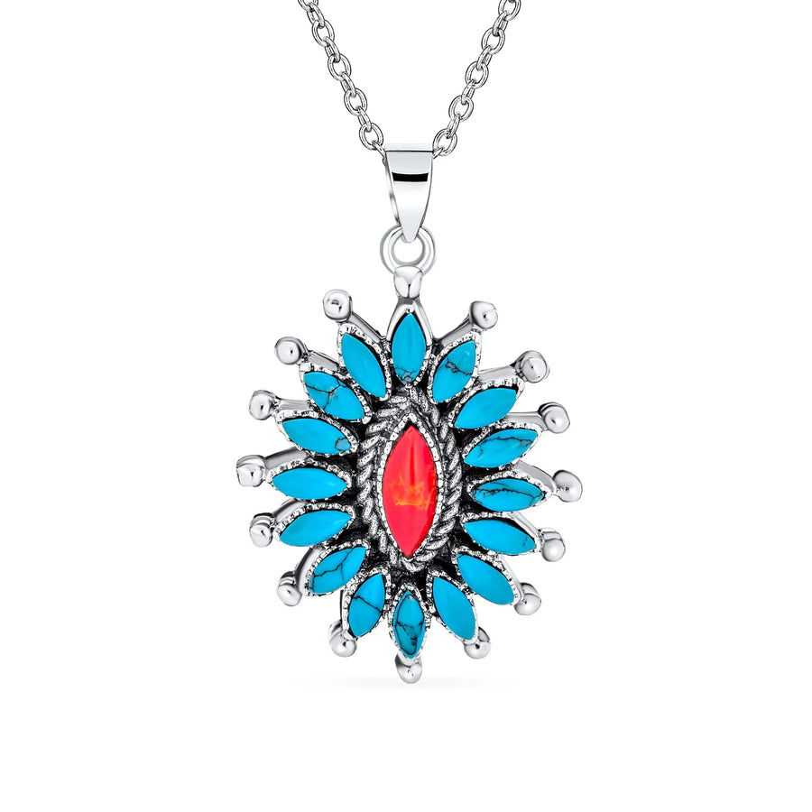 - Enhance your style with this unique southwestern flower pendant. Add a stunning squash blossom to your Stabilized Turquoise jewelry collection. Inspired by southwestern Turquoise designs, this native American style pendant is a must-have. Perfect .925 Sterling Silver jewelry for everyday chic. This Stabilized Turquoise and Dyed Coral pendant is ideal for women who love unique, colorful .925 Sterling Silver necklaces. Gift this southwestern jewelry to your mom for Mother's Day. Chain included.