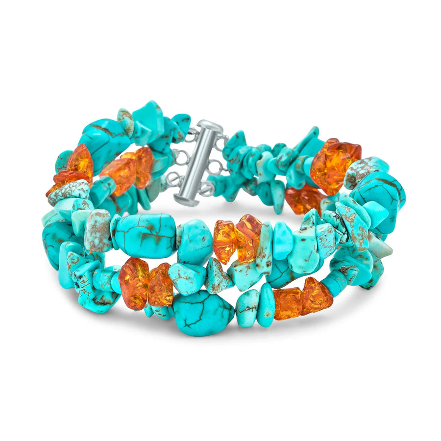 - An exquisite wide multi strand gemstone chip bracelet to add a luscious pop of color with Western chic glam to every look. This stunning bracelet features a vivid two tone, three strand design, with Stabilized Turquoise nuggets and amber, with a sterling silver bar clasp.