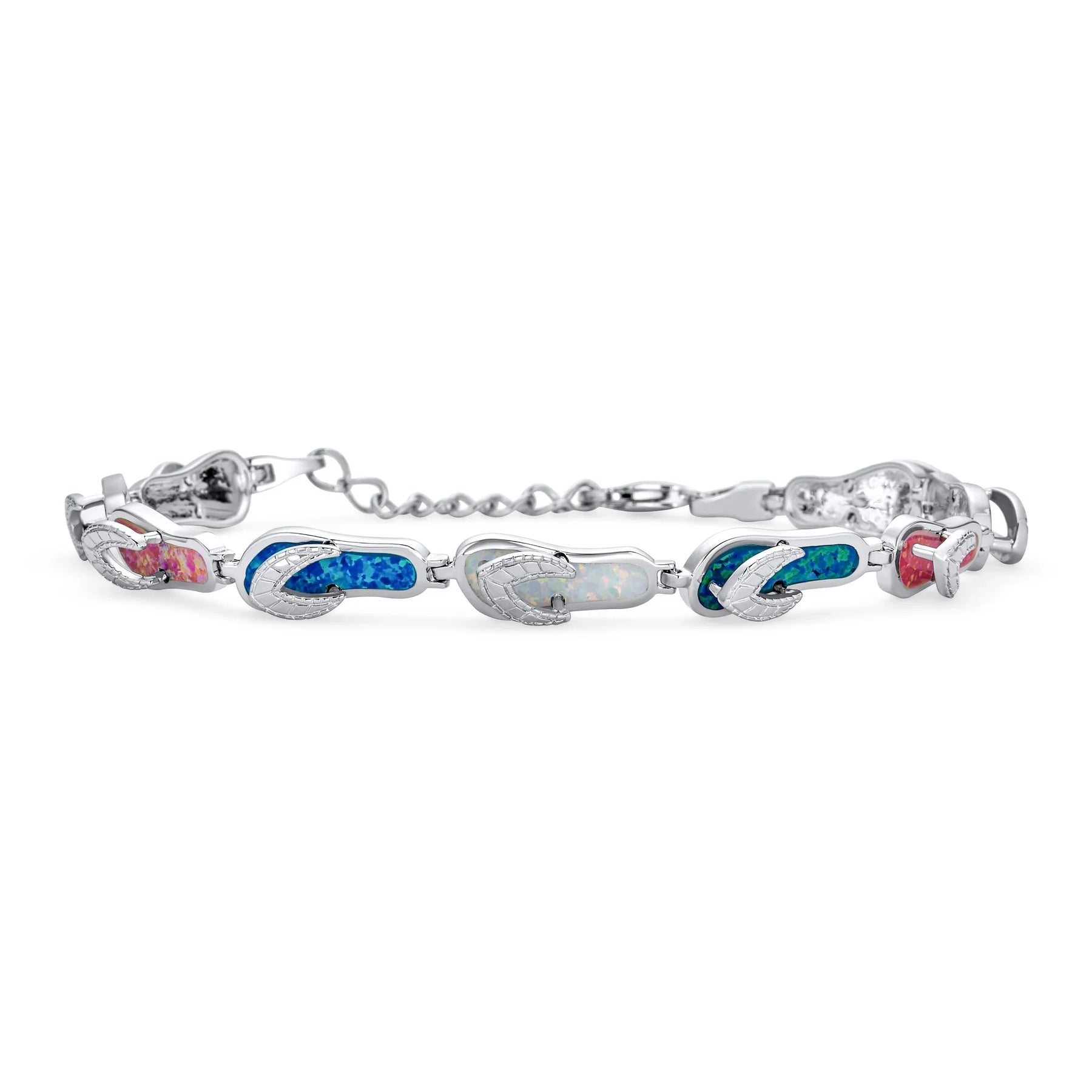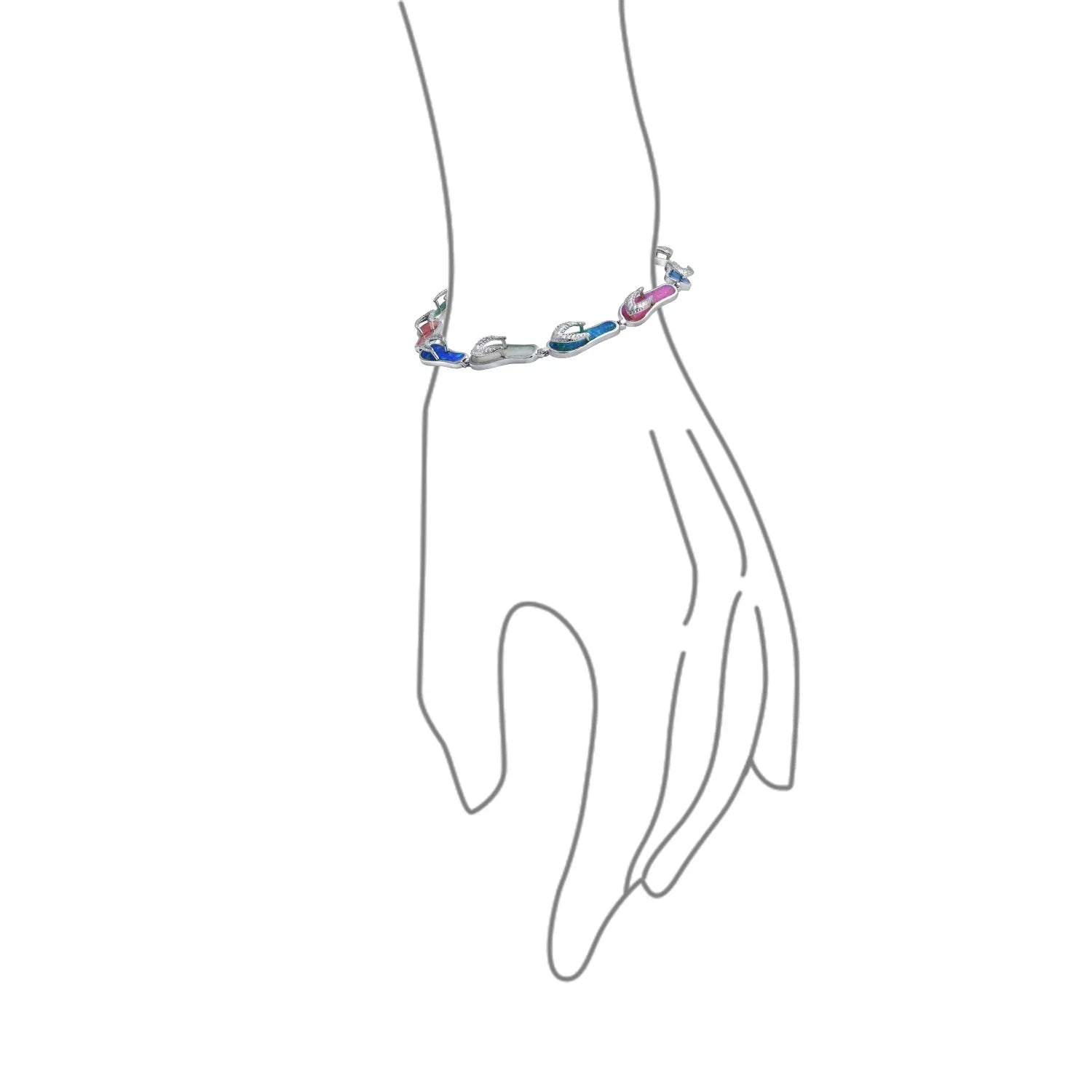 - Nothing epitomizes summer like flip flop sandals. This multi-color Created Opal bracelet transports you to your favorite season. Perfect for vacations or reminiscing warm weather. Blue, green, white, and pink Created Opal inlay adorns nine sparkling sandals. Sterling silver bracelet with vibrant colors is ideal summer jewelry. Radiant hues complement any summer outfit. Feel beach vibes with this fun October birthstone bracelet. Reminds you of sun-soaked memories.