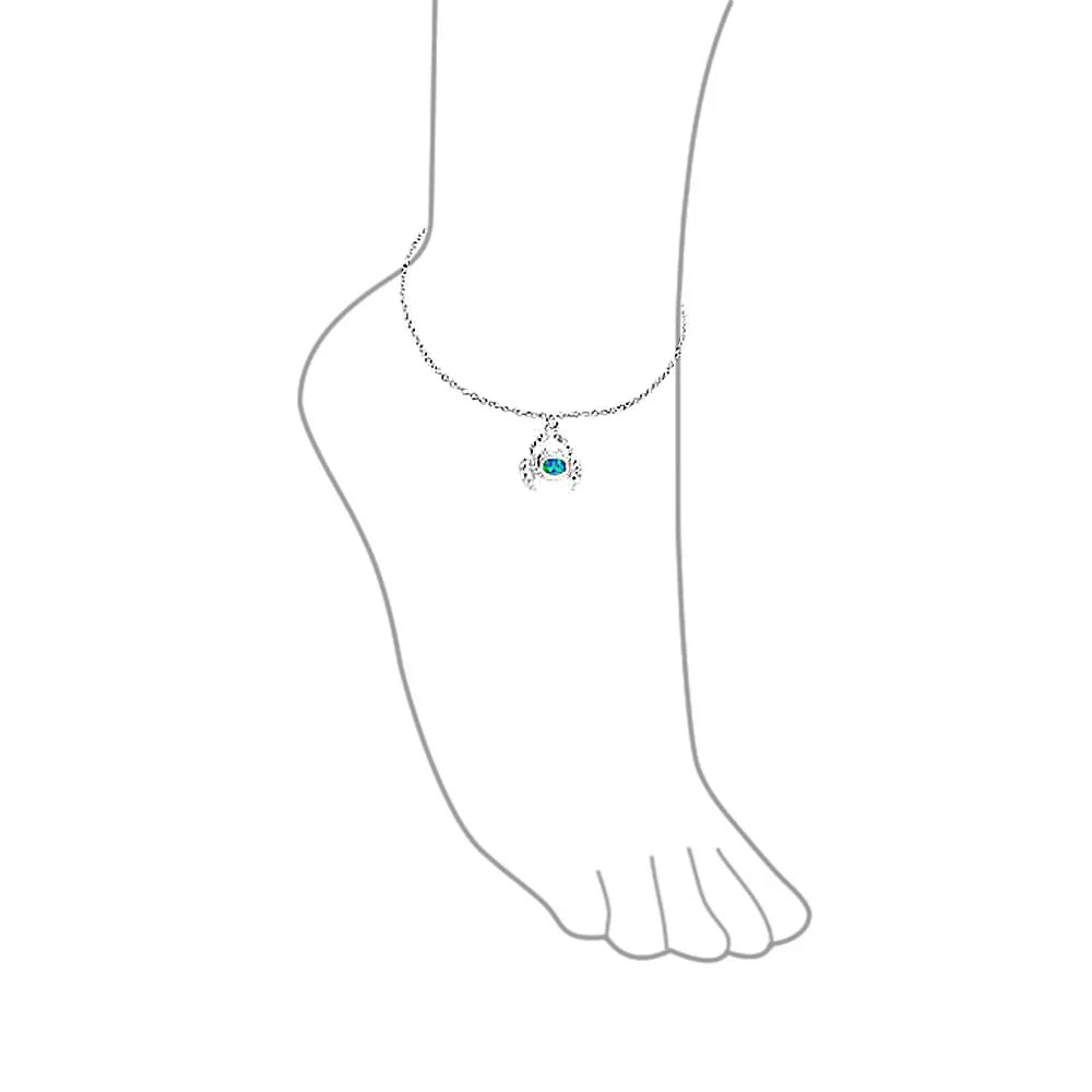 - Keep company all summer with our adorable crabby anklet. This stunning sterling silver jewelry features a delicate rolo chain. Adjustable up to 9 inches with an extender, secured with an easy-to-use lobster clasp. The centerpiece is a half-inch charm shaped like a detailed silver crab. Adorned with a sparkling Created Opal, showcasing blue and green ocean shades. Perfect for warmer months, adding charm to any outfit. Lightweight design ensures comfort for all summer activities. Don't miss this irresistibly cute Created Opal anklet - order yours today.