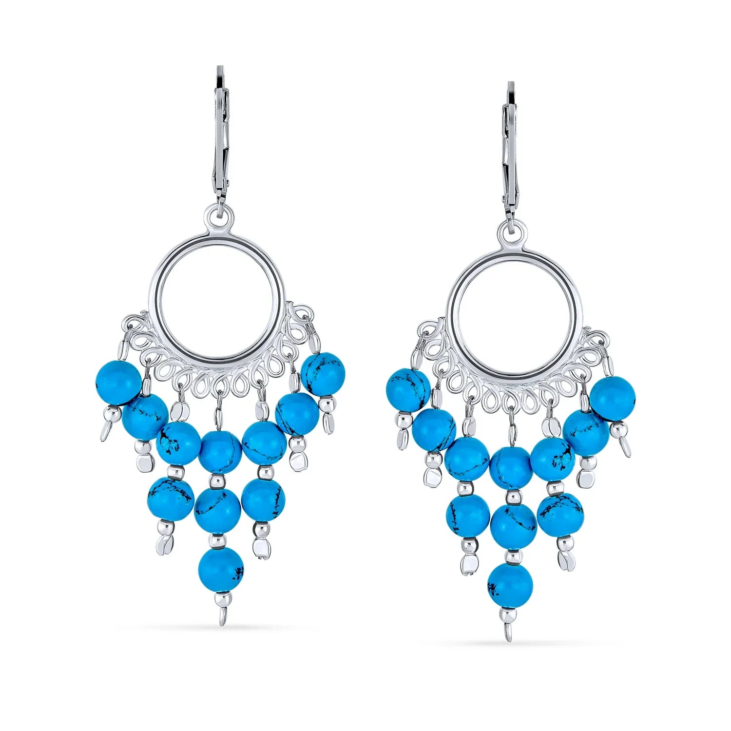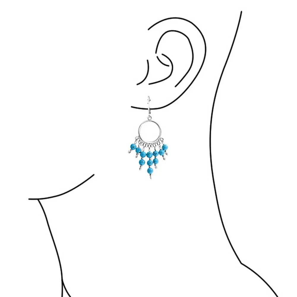 - Elevate your style with our stunning turquoise blue beaded drop earrings . These bold earrings feature shimmering blue stones. Instantly brighten any outfit with these stylish earrings. The 5mm turquoise beads dangle from seven sterling silver strands. Create a beautiful, eye-catching look with these earrings. Perfect for the office, a night out, or everyday wear. Sterling silver accents add detail and movement. Lever back closure ensures a secure fit. Lightweight at just 7.0 grams for all-day comfort. Treat yourself or surprise a friend with December birthstone earrings. Order now to add elegance to your jewelry collection.