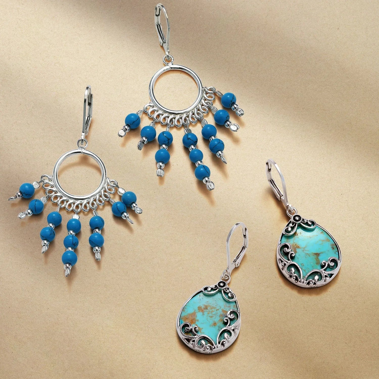 - Enhance her look with our Retro Bohemian Hippie Chic Turquoise Chandelier Earrings, showcasing a vibrant blue southwestern design. Adorned with three dangling freshwater cultured pearls, these earrings are ideal for daily wear and seamlessly elevate any ensemble for a night out.
