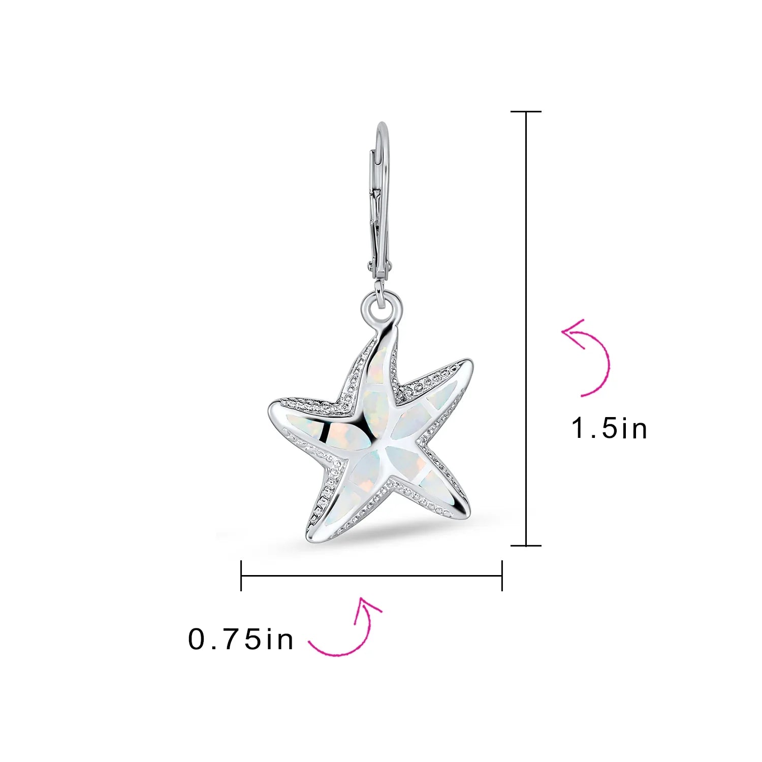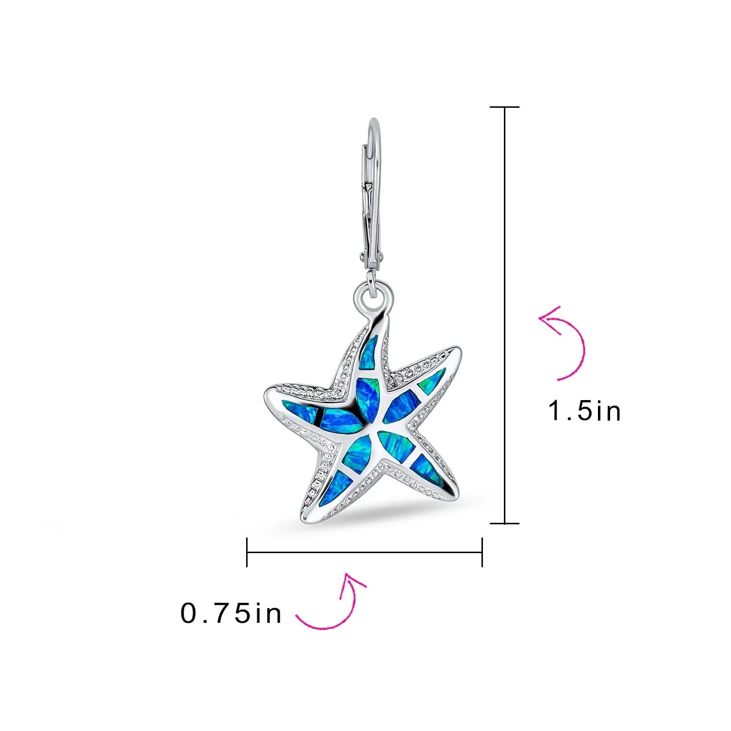 - Dive into the seas with sterling silver starfish lever back earrings. Perfect for your summer wardrobe, these dAngles feature textured edges. Set with shimmering Created Blue Opal inlay, reminiscent of the sparkling sea. Created Opal jewelry flashes an array of colors, taking you back to summer. Lever back ear wire allows these sea creatures to dangle and sway, catching the light. Blue jewelry looks great on everyone, adding a pop of color that everyone will notice.
