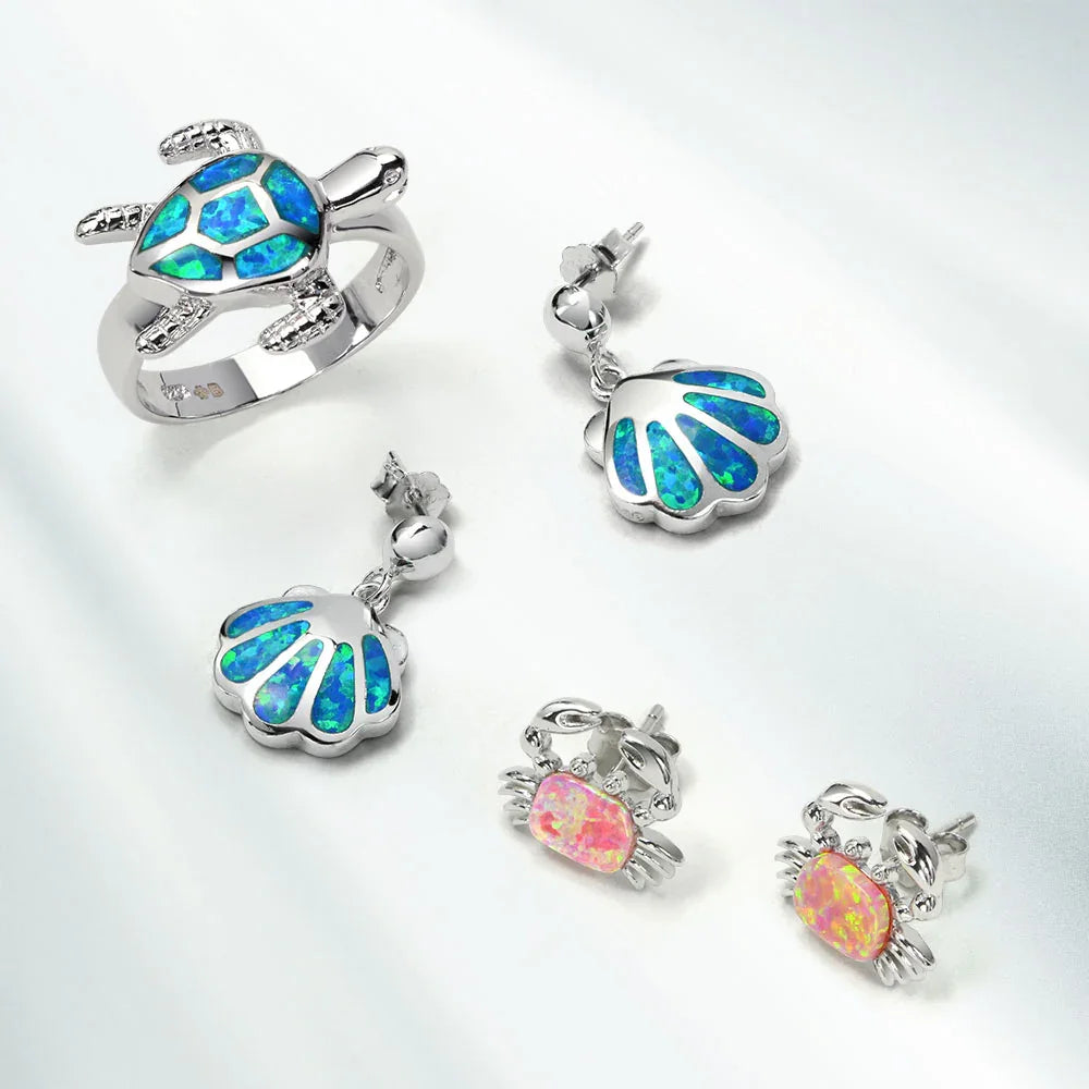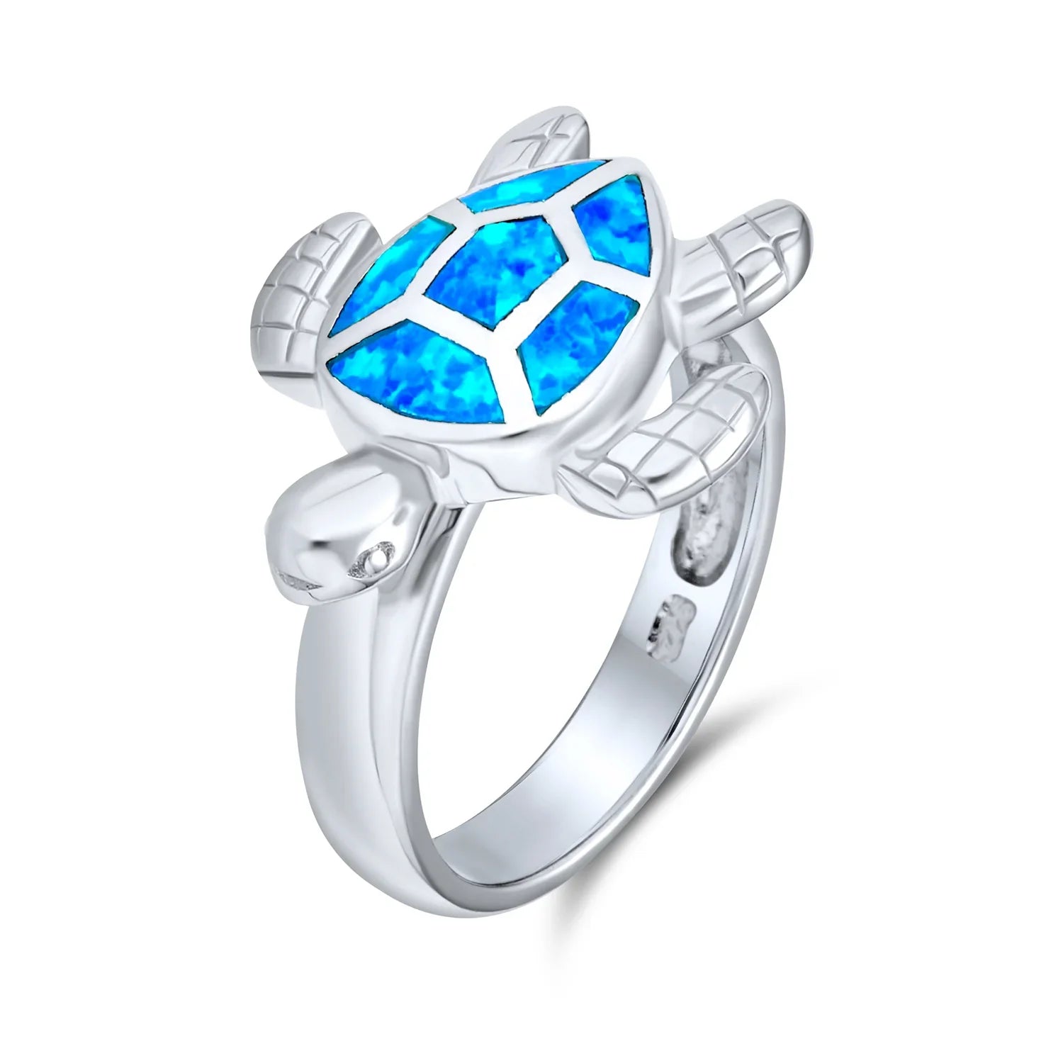 - Add deep sea style to your glam with our sterling silver Created Blue Opal inlay nautical sea turtle ring. This sterling silver nautical ring is playful and stylish, perfect for fashionable women of all ages. Made entirely in 925 sterling silver, it’s rhodium plated to resist tarnish and maintain its shine. Created Opal, the October birthstone, is known for its beautiful play of colors. It’s the perfect gift for yourself or a loved one with an October birthday. Embrace your whimsical side with sterling silver sea turtle jewelry and make a fashionable splash.